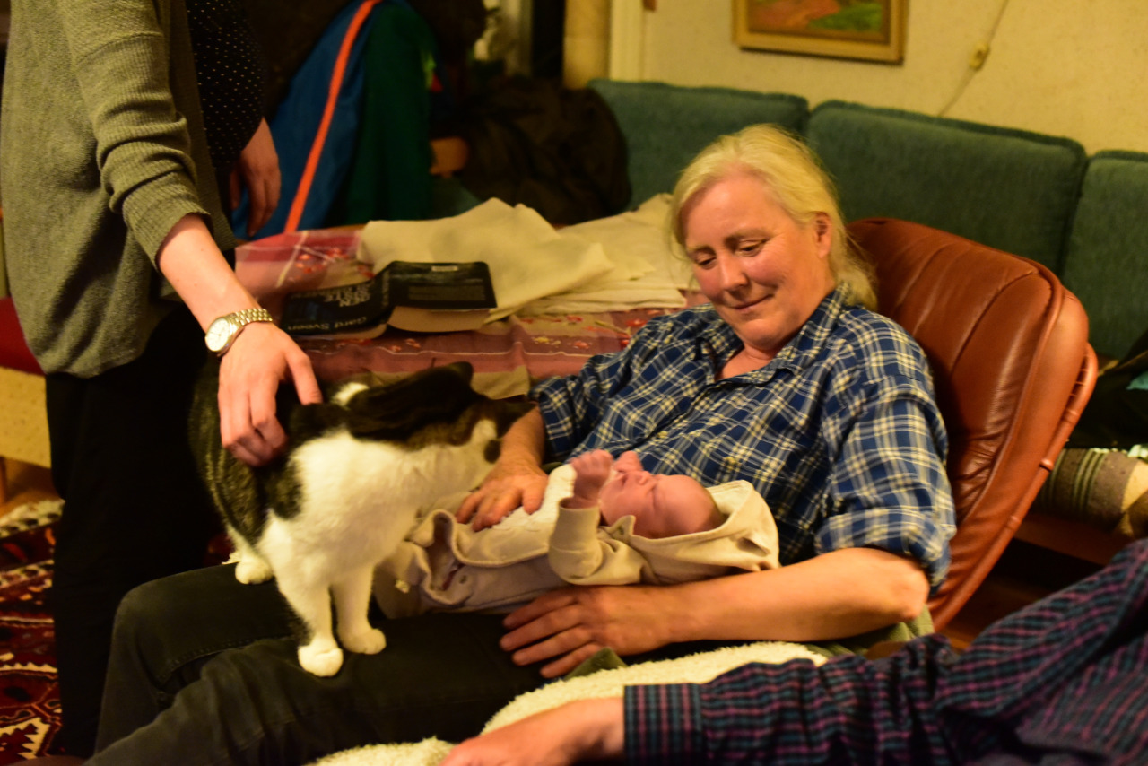 Katten Nisse tittar skeptiskt på den nya ockupanten av Karins famn.