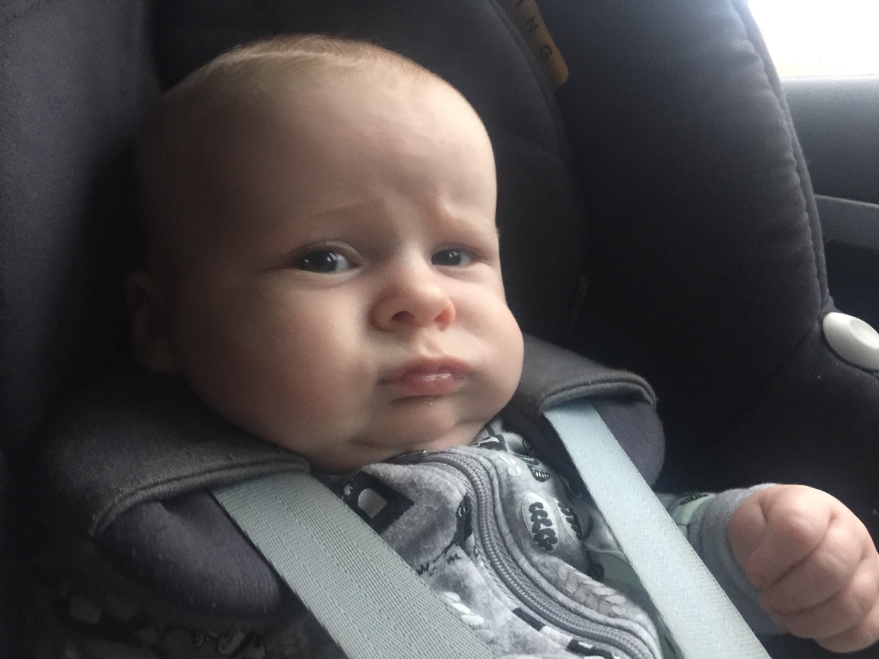 Trollhättan tur och retur. Erik börjar bli en van resenär. Han sover gott i sitt babyskydd, Maxi Cosi Pebble. I början var han lite för liten för det men nu sitter han bra.