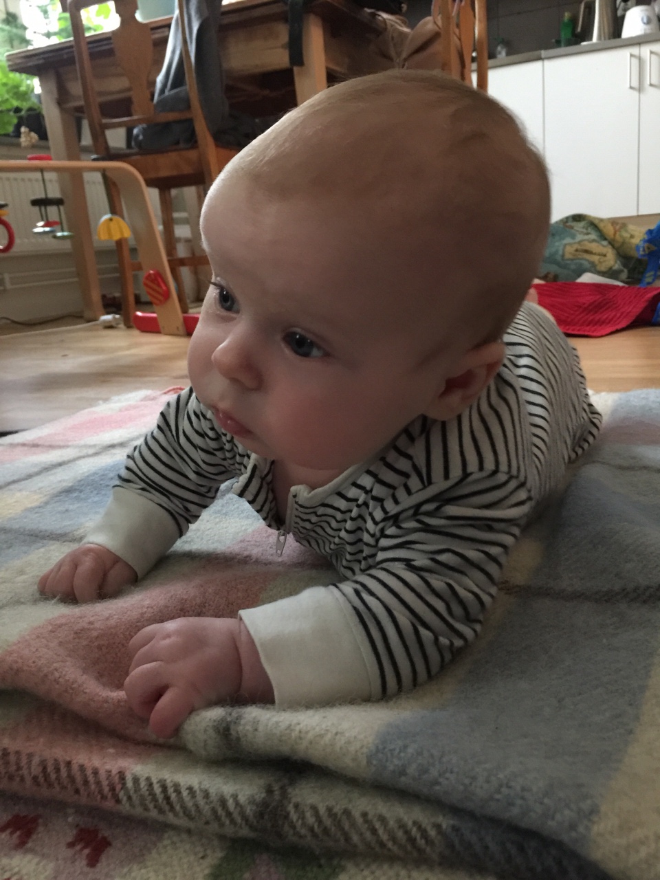 Ligga på mage har två gånger slutat i att han hamnat på rygg. Vi fick inte se det någon av gångerna…
