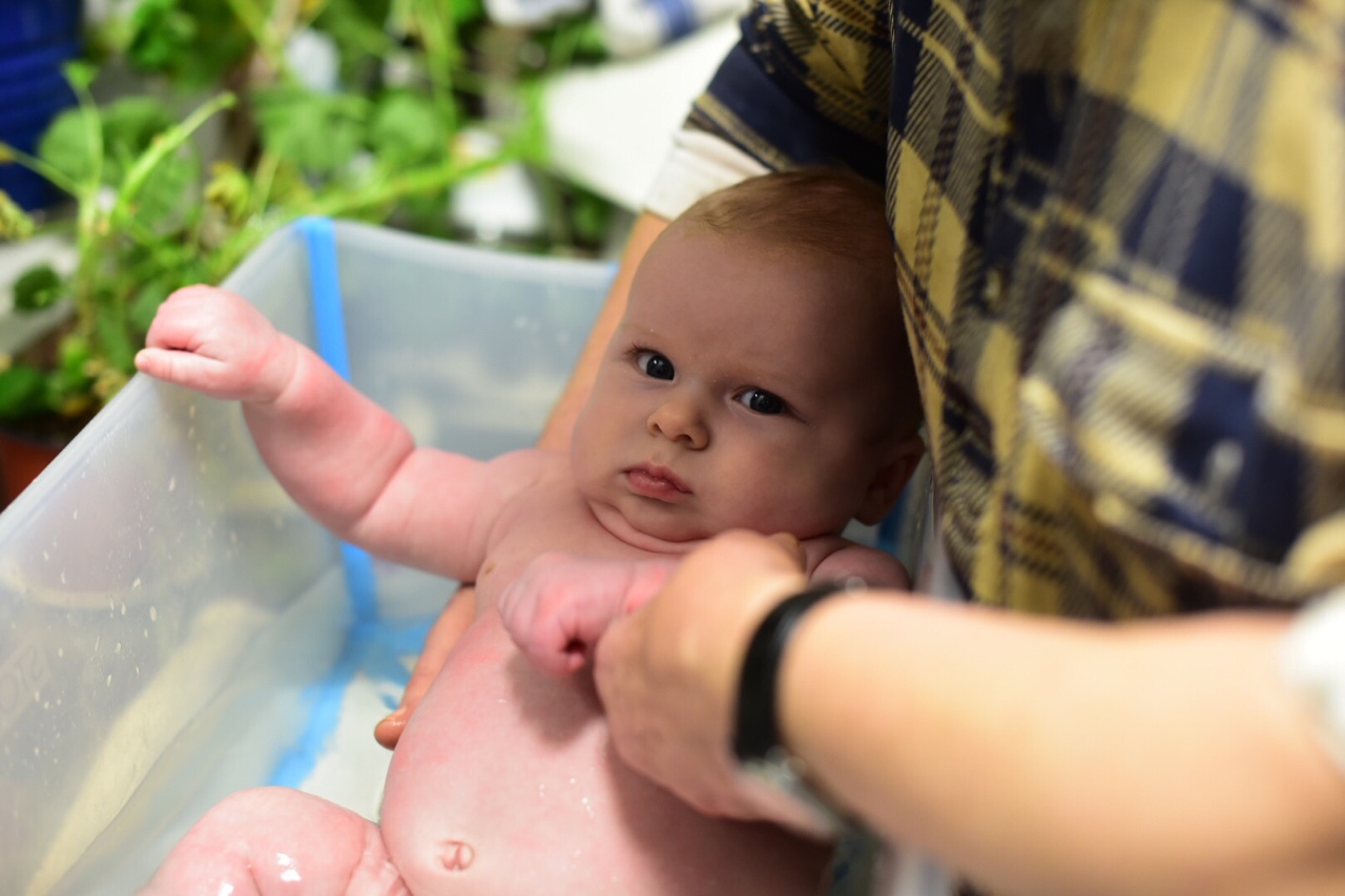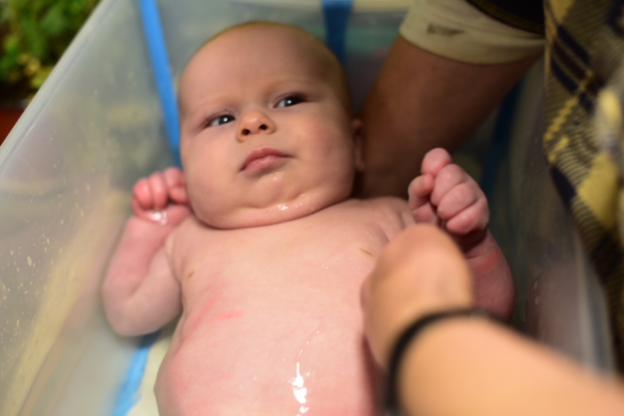 Eriks första bad! Hittills har han fått duscha med pappa, men nu när vi har en badbalja blir det nog fler bad. Första gången blev extra traditionsrik hemma hos mormor på diskbänken. Här badades hans mor också.