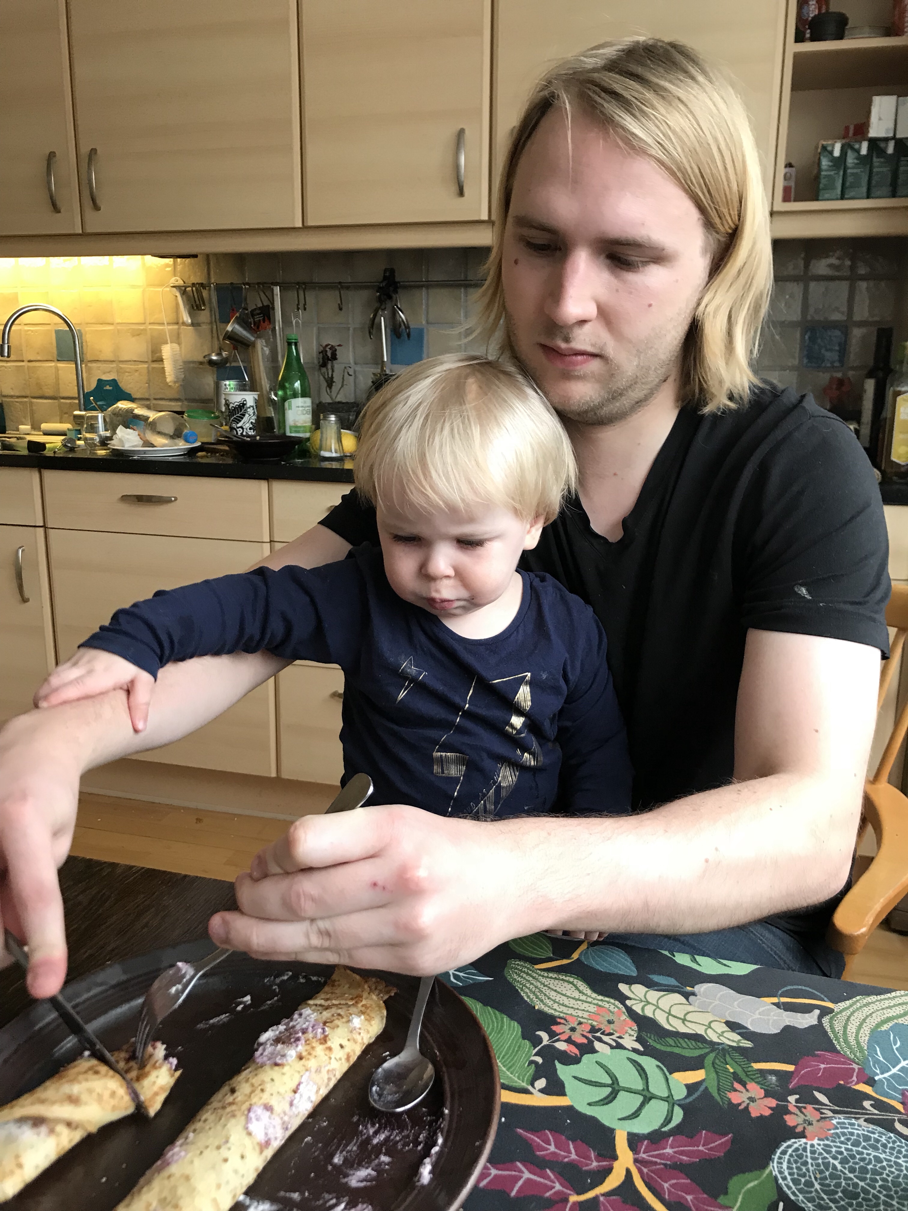 Får man sitta i famnen och bli matad med pannkakor med blåbärssylt och grädde.