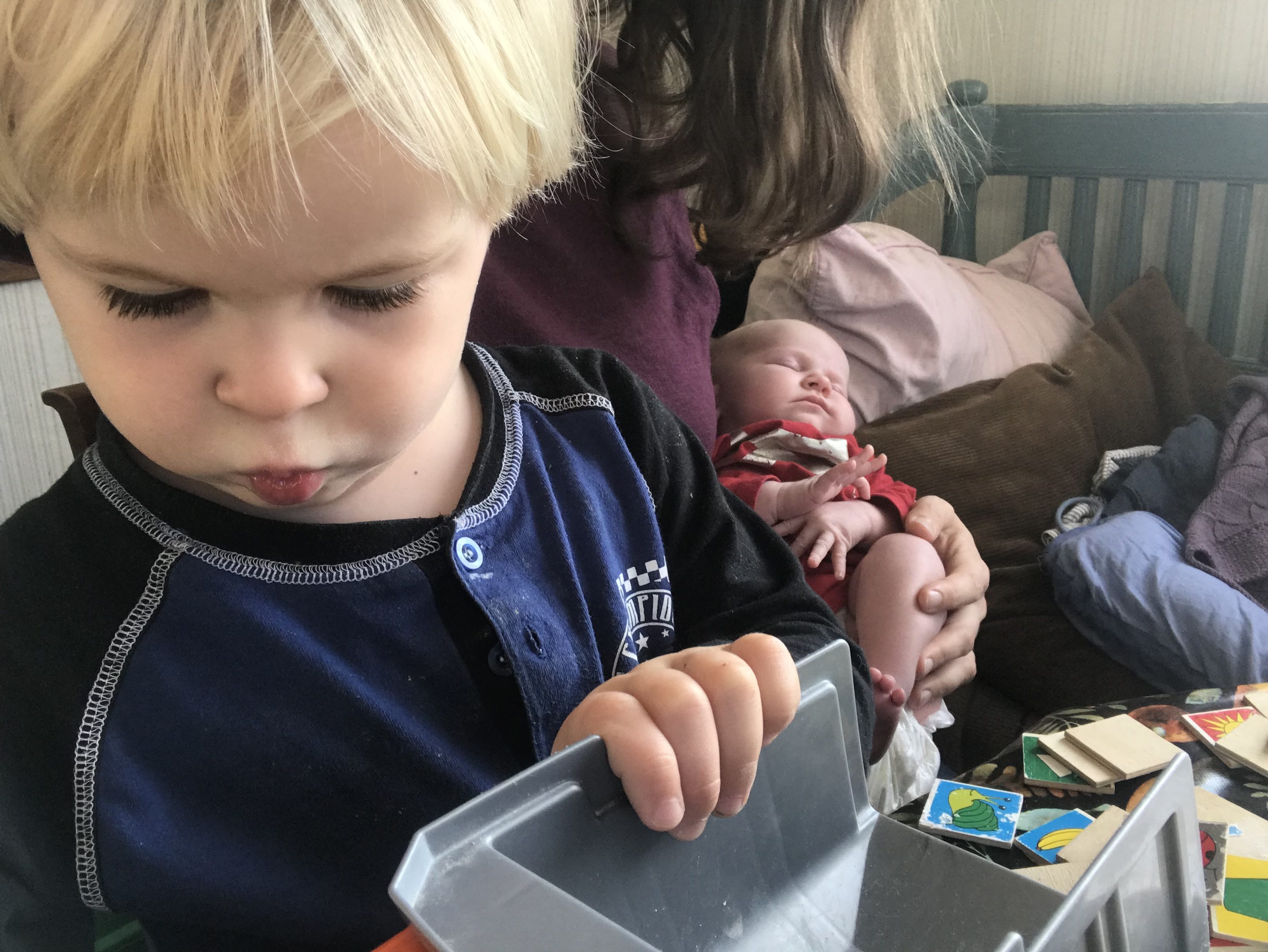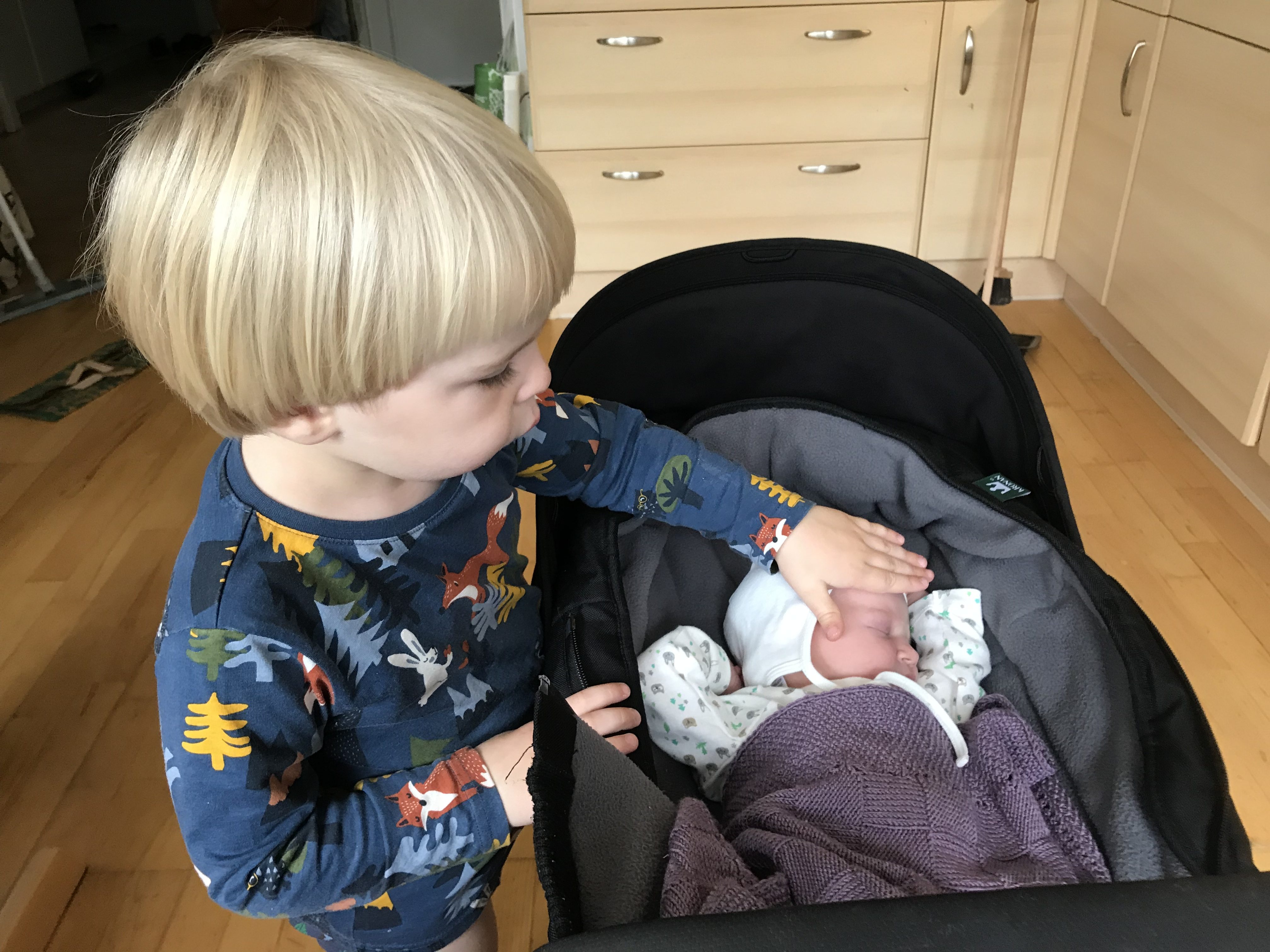 Erik har varit en jättemysig storebror som tycker om att klappa sin lillasyster. Han har också provat att bädda ner sig i den nya vagnen, provat Astrids napp och bett mamma avlägsna systern ur famnen på pappa med omedelbar verkan.