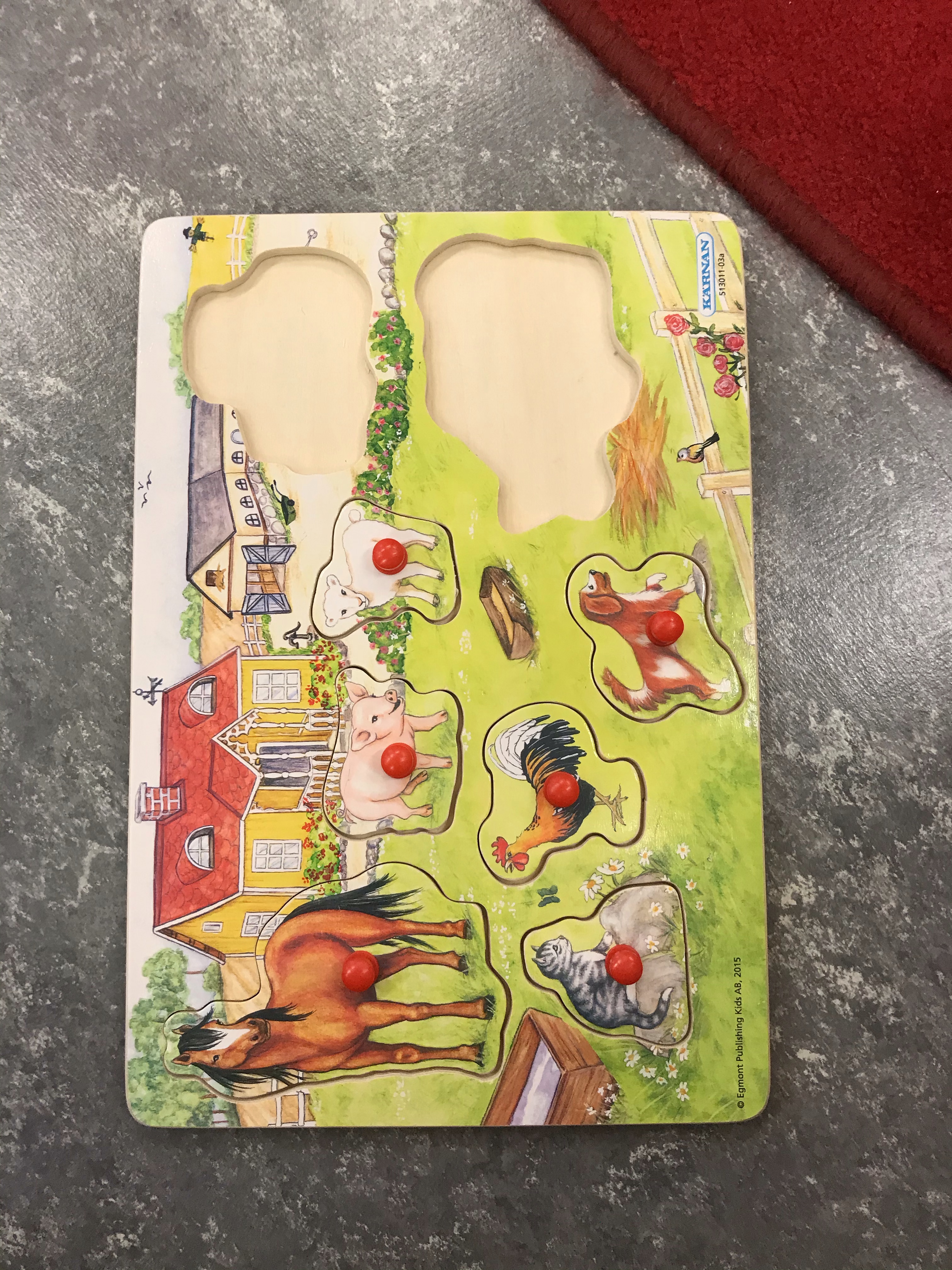 Utöver en fantastiskt fin tågbana fanns det ett pussel med lantbrukstema, bilar och en låda med djur.