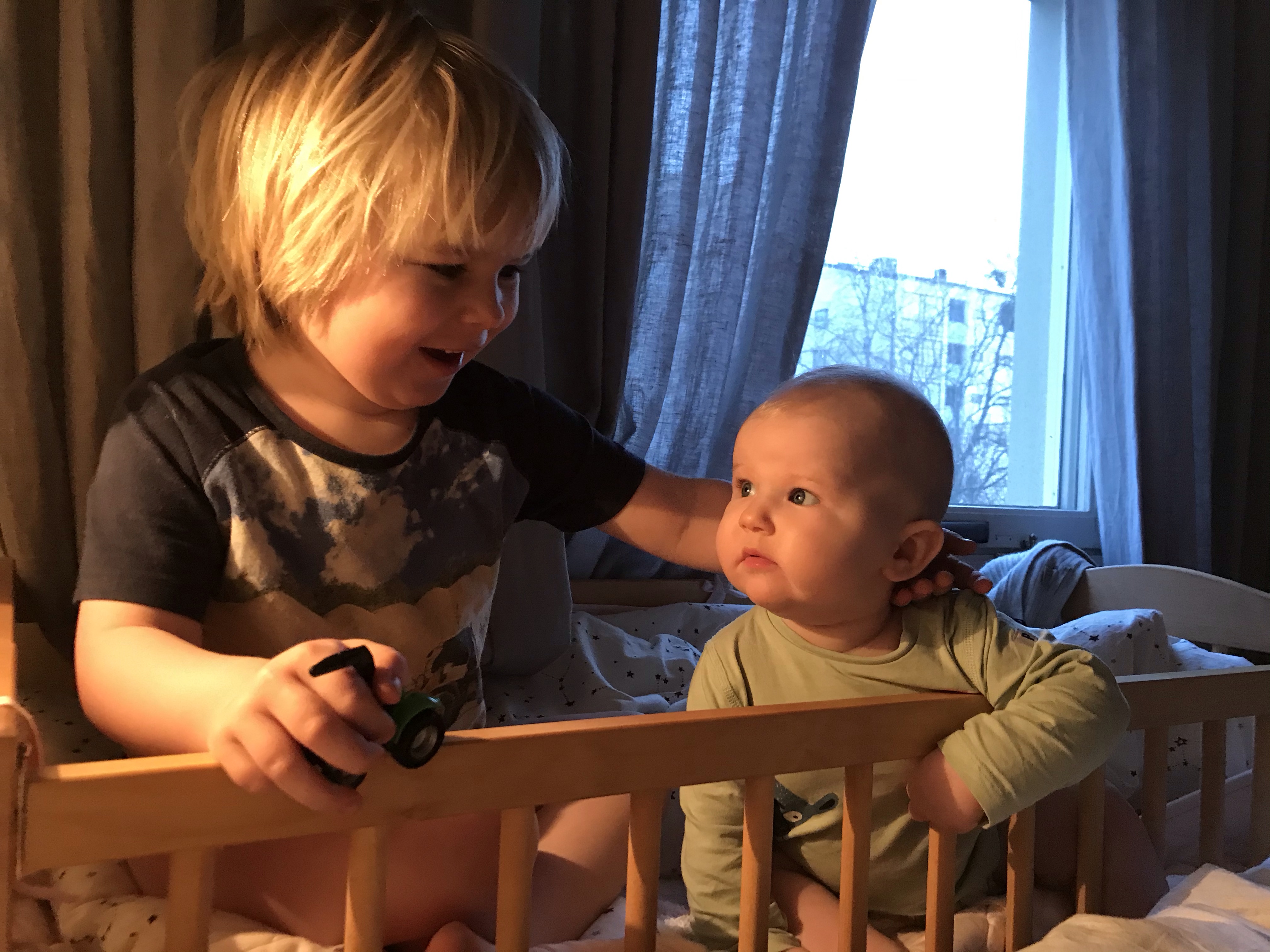 “To lelle” säger han och kramar lillasyster. Finaste bror och syster har så mycket glädje av varandra!