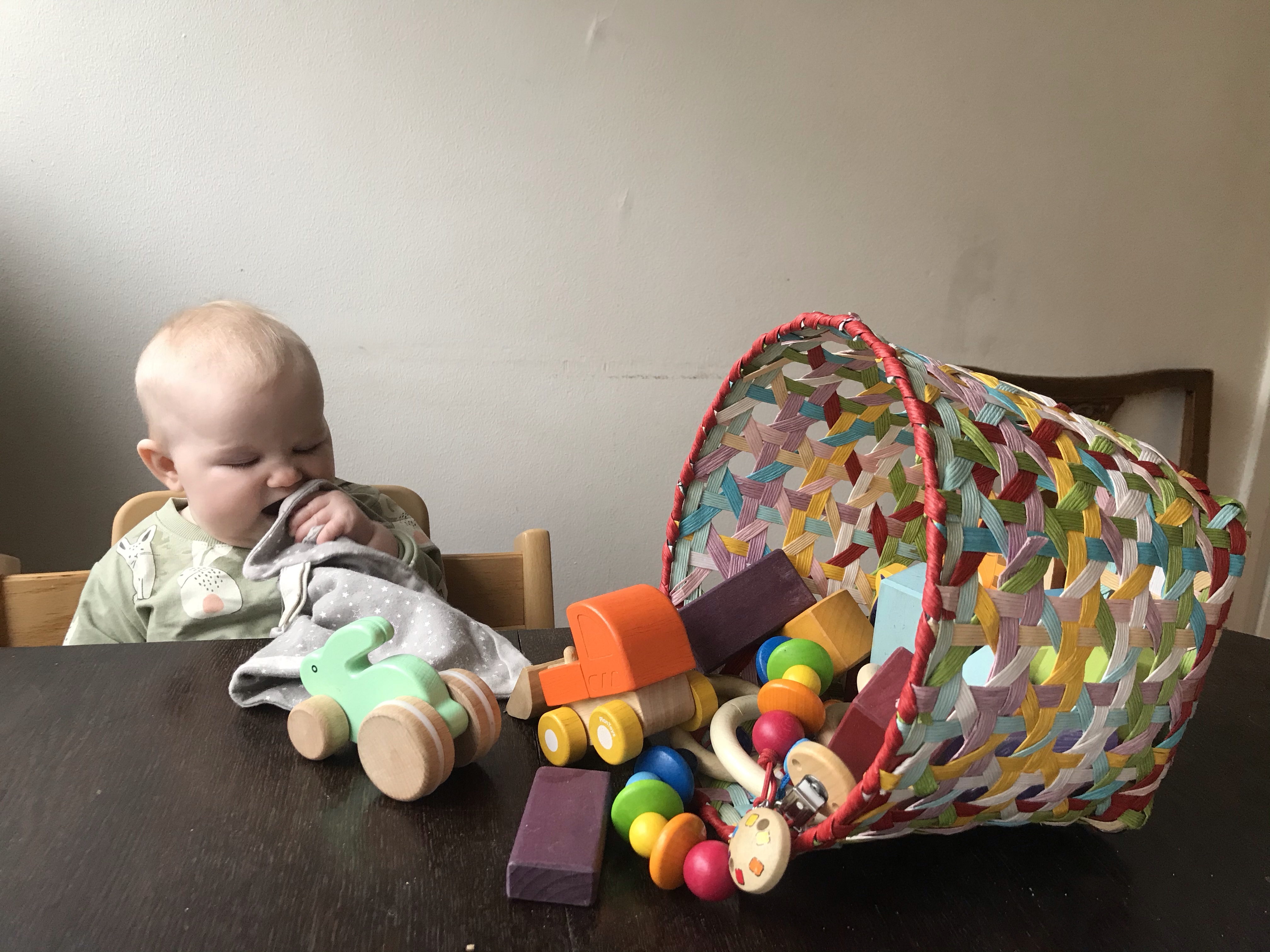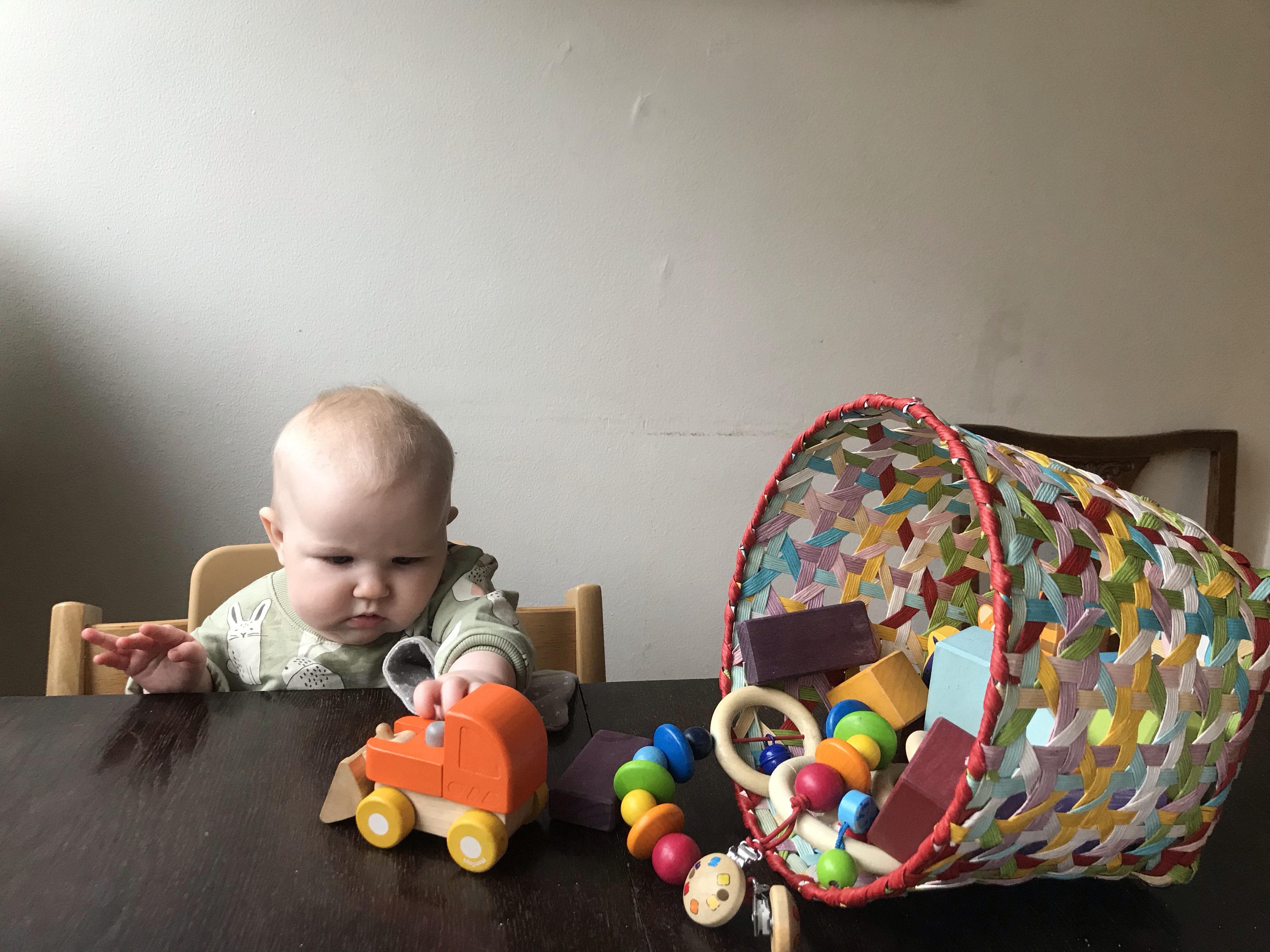 Eftersom han inte får ha med sin snuttetraktor har han istället valt ett par klossar som får agera “traktor” som han är noga med var han ställer när han inte får ta med dem.