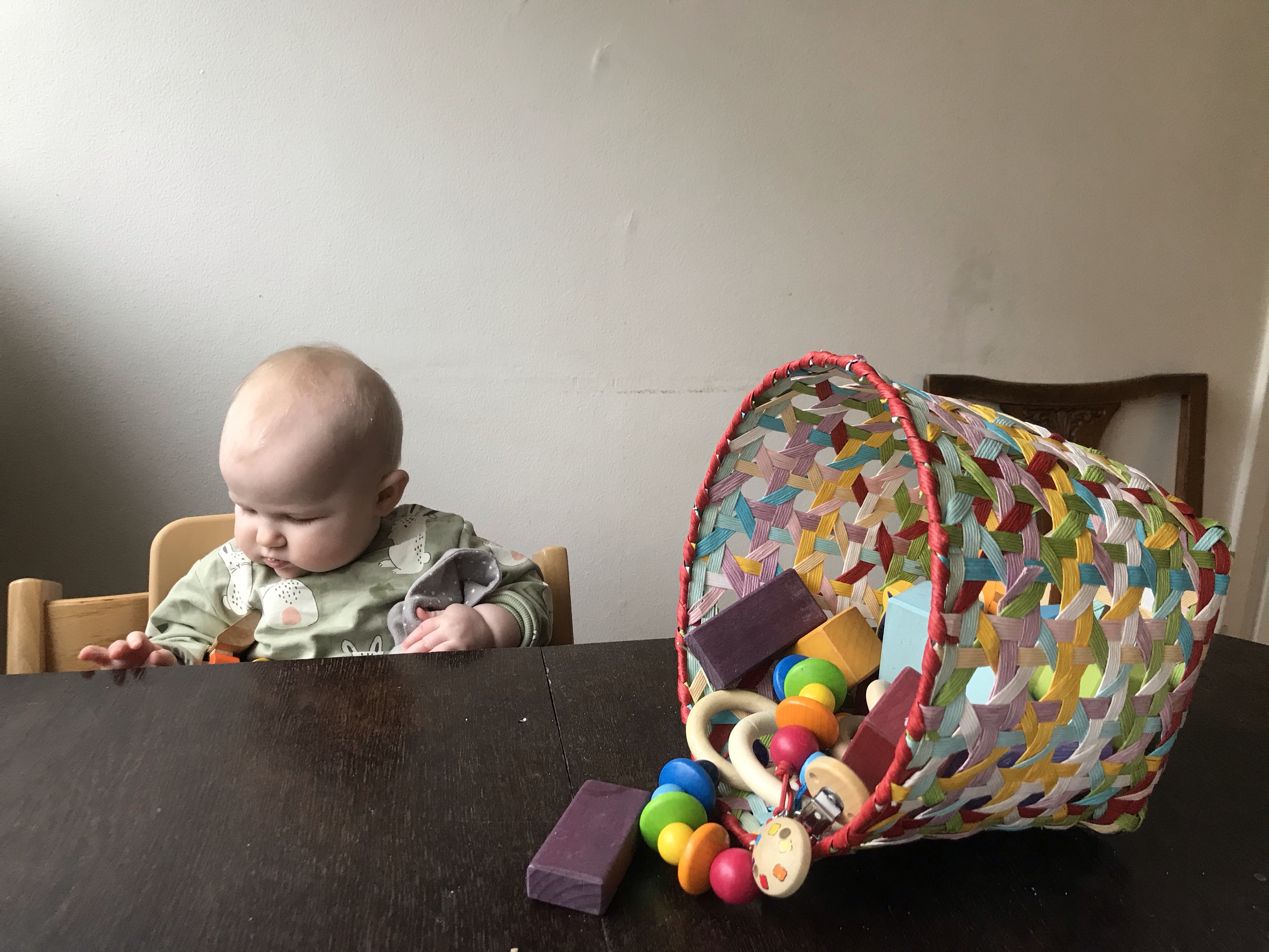 Vår lilla leksakskonnässör börjar få ett vant handlag med sina leksaker.