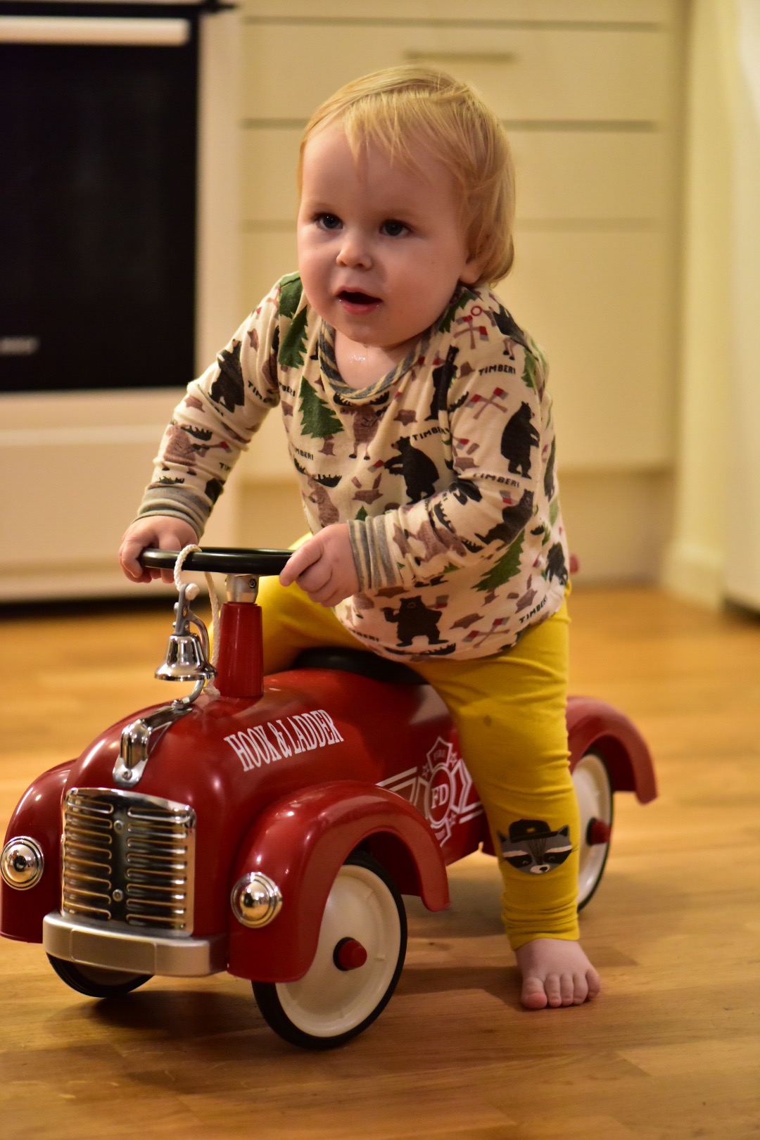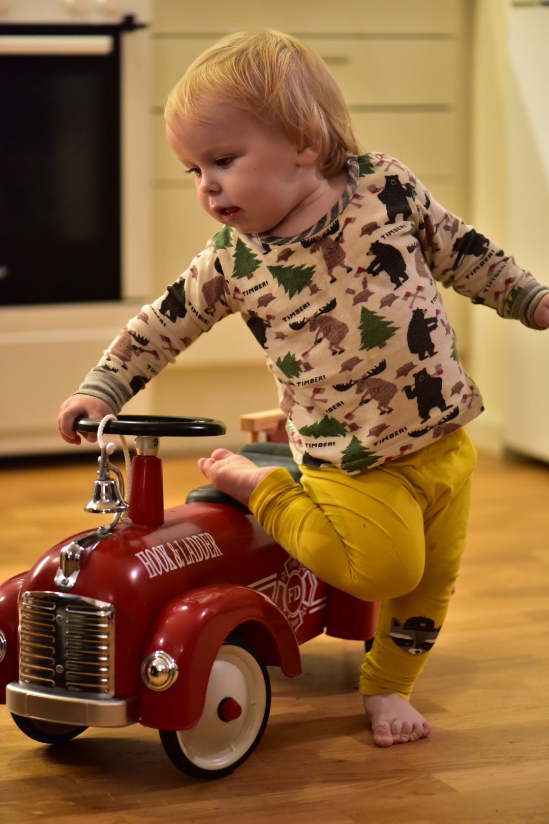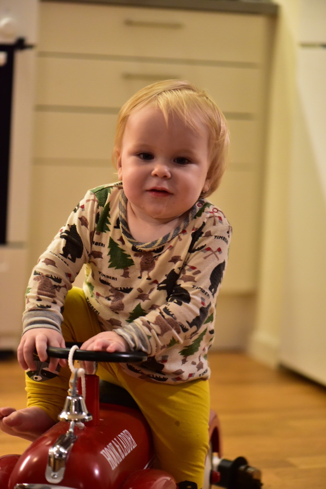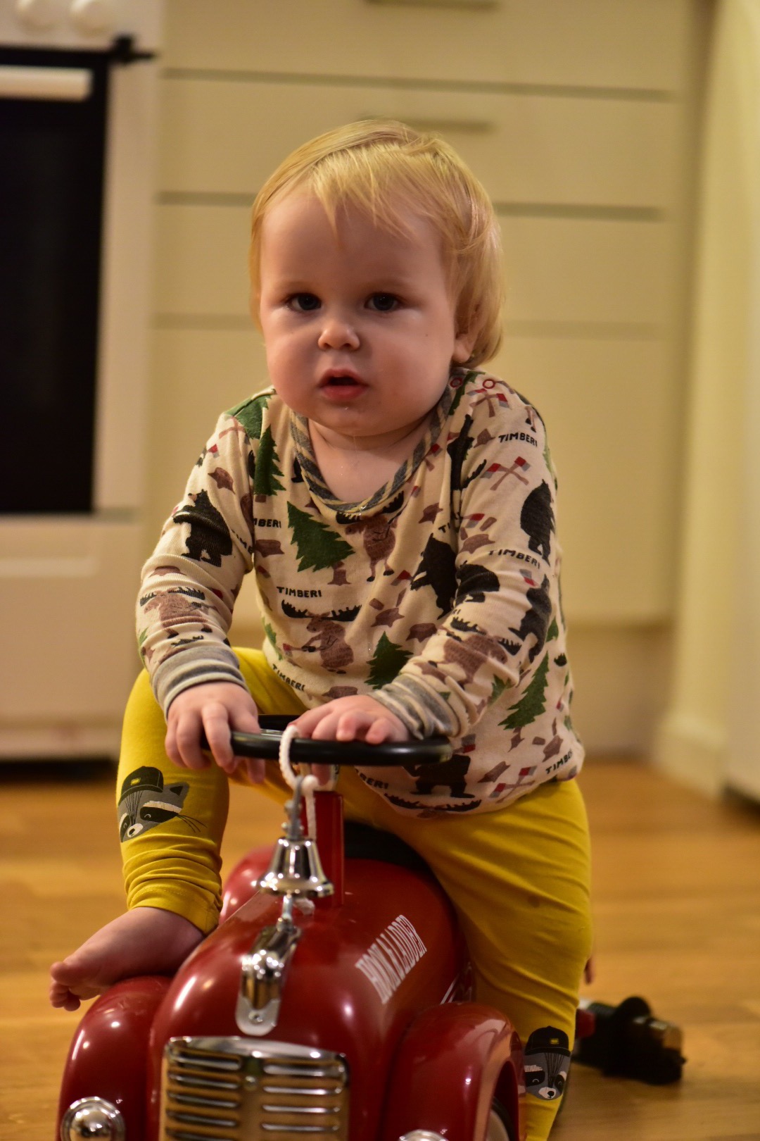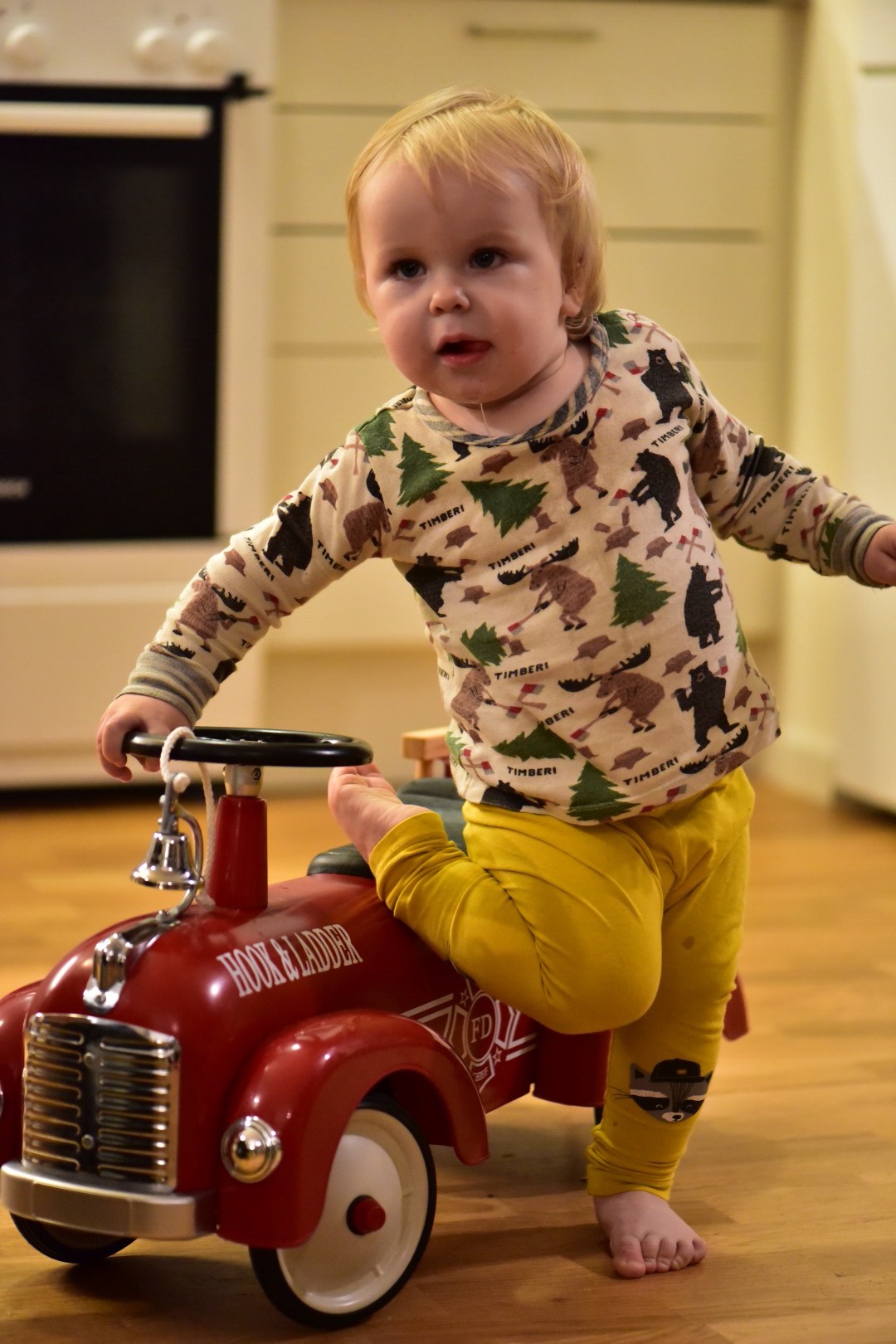 Erik har börjat anse att pappa bör vara utan tröjan och t-shirt när vi går och lägger oss tillsammans. Pappa försöker ibland komma undan det, och då säger Erik ifrån efter en stund. Så även ikväll “Ta a trö-a”. Pappa suckar och lyder. Då flinar Erik och säger: “Ta a by”. Pappa kan inte låta bli att skratta, och tar av sig byxorna också. Erik var mycket belåten.