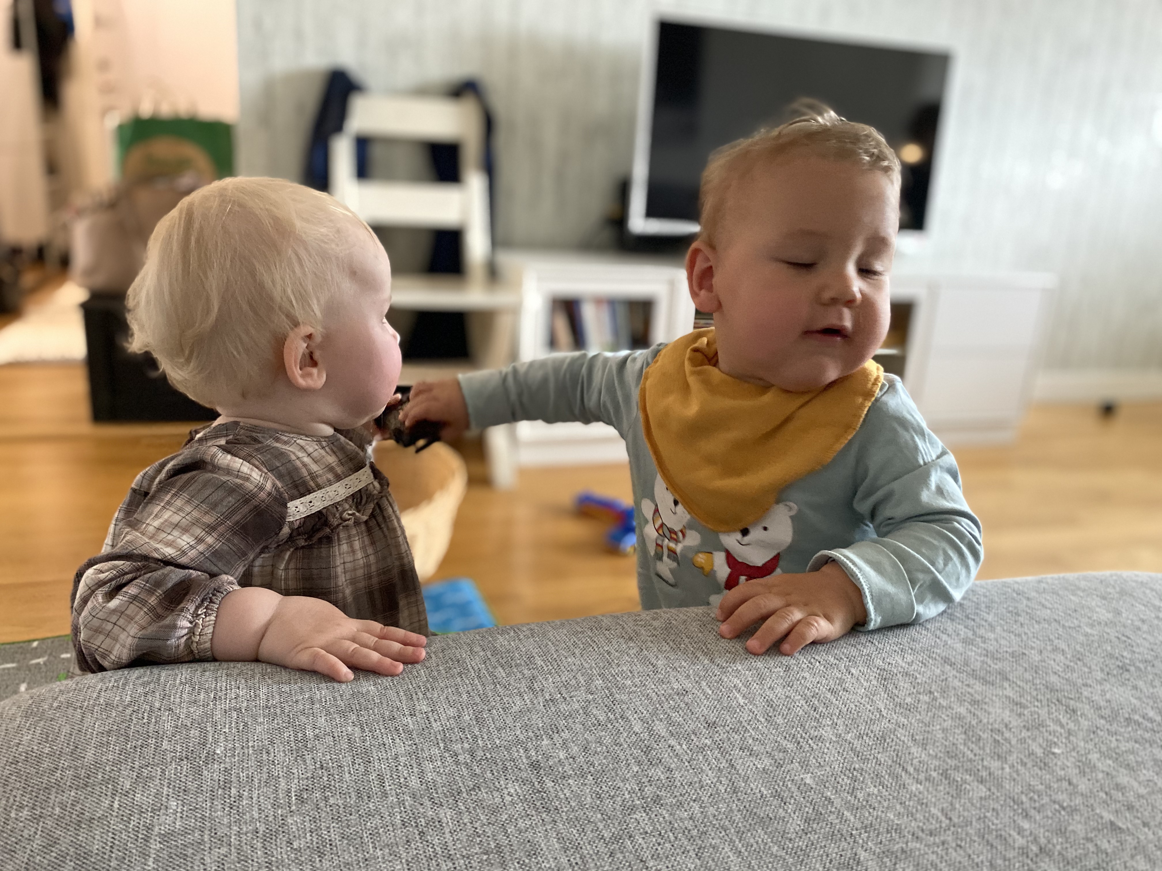 Erik har börjat anse att pappa bör vara utan tröjan och t-shirt när vi går och lägger oss tillsammans. Pappa försöker ibland komma undan det, och då säger Erik ifrån efter en stund. Så även ikväll “Ta a trö-a”. Pappa suckar och lyder. Då flinar Erik och säger: “Ta a by”. Pappa kan inte låta bli att skratta, och tar av sig byxorna också. Erik var mycket belåten.