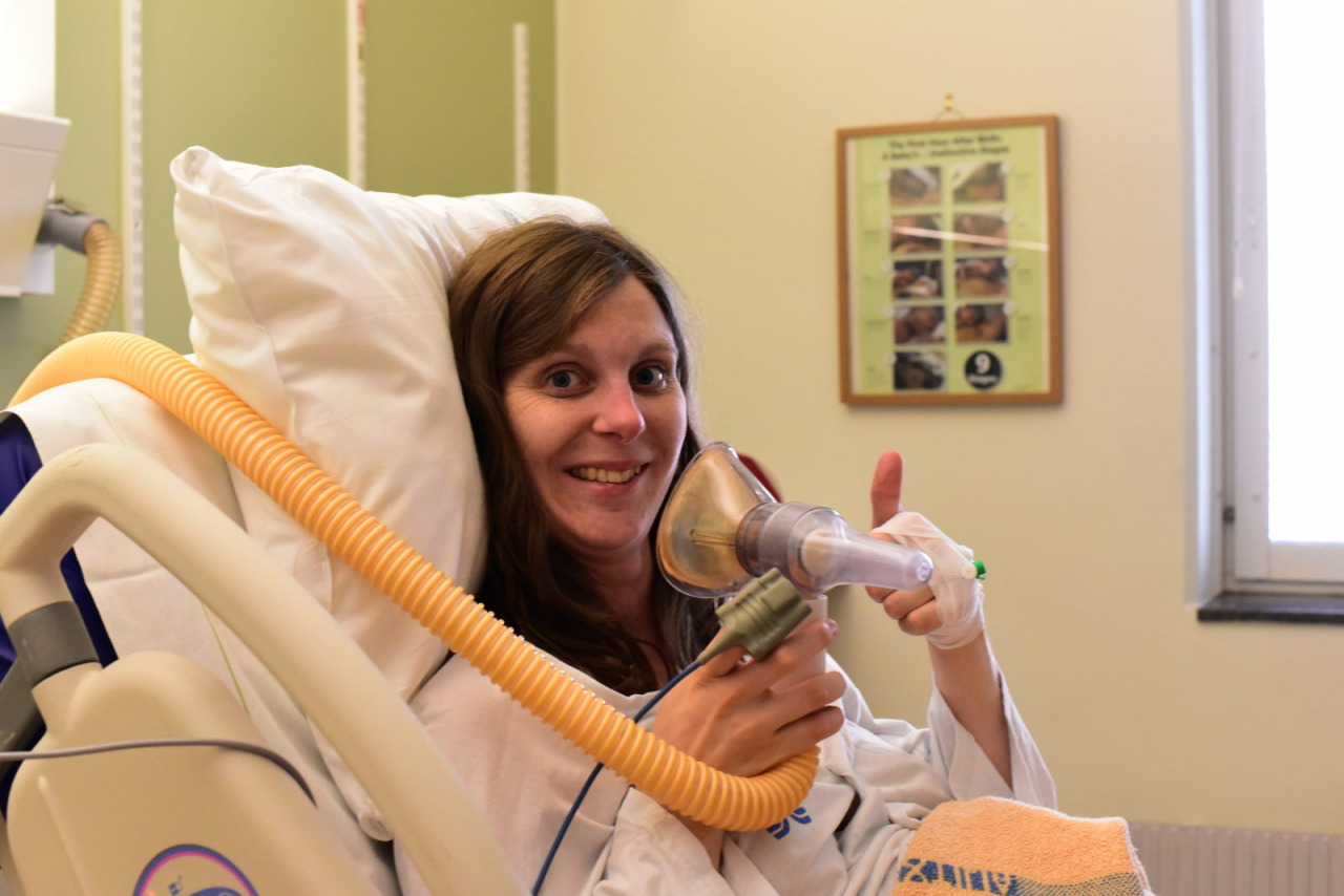 Värkarna började vid 03, och vi åkte in till förlossningen kring 09. Värkarna hade snabbt blivit regelbundna, och Charlotta hade väldigt ont. Efter att ha fått lustgas och dextrosol piggnade hon till lite framåt 12-tiden, men efter den här bilden gick det snabbt utför igen…