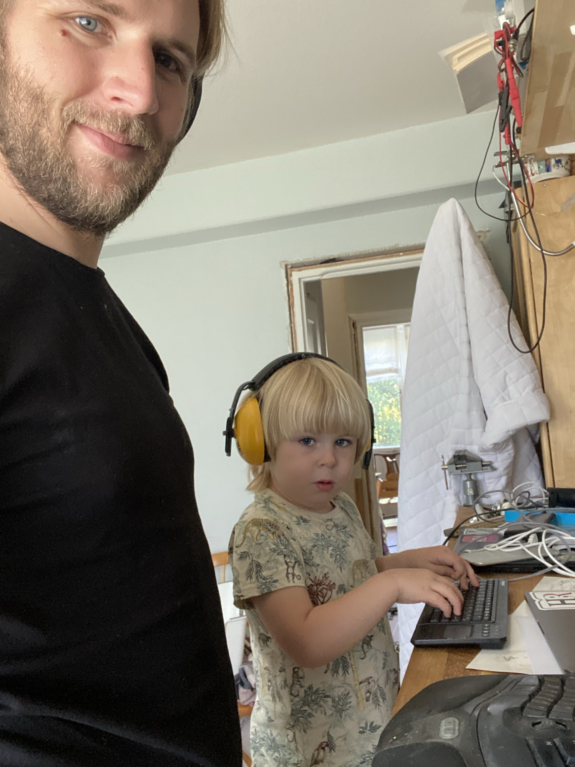 Pappas dagliga avstämning via skype. Pappa tar på hörlurarna. Erik hämtar sina kåpor och ett tangenbord. Då vill lillasyster Astrid också vara med.