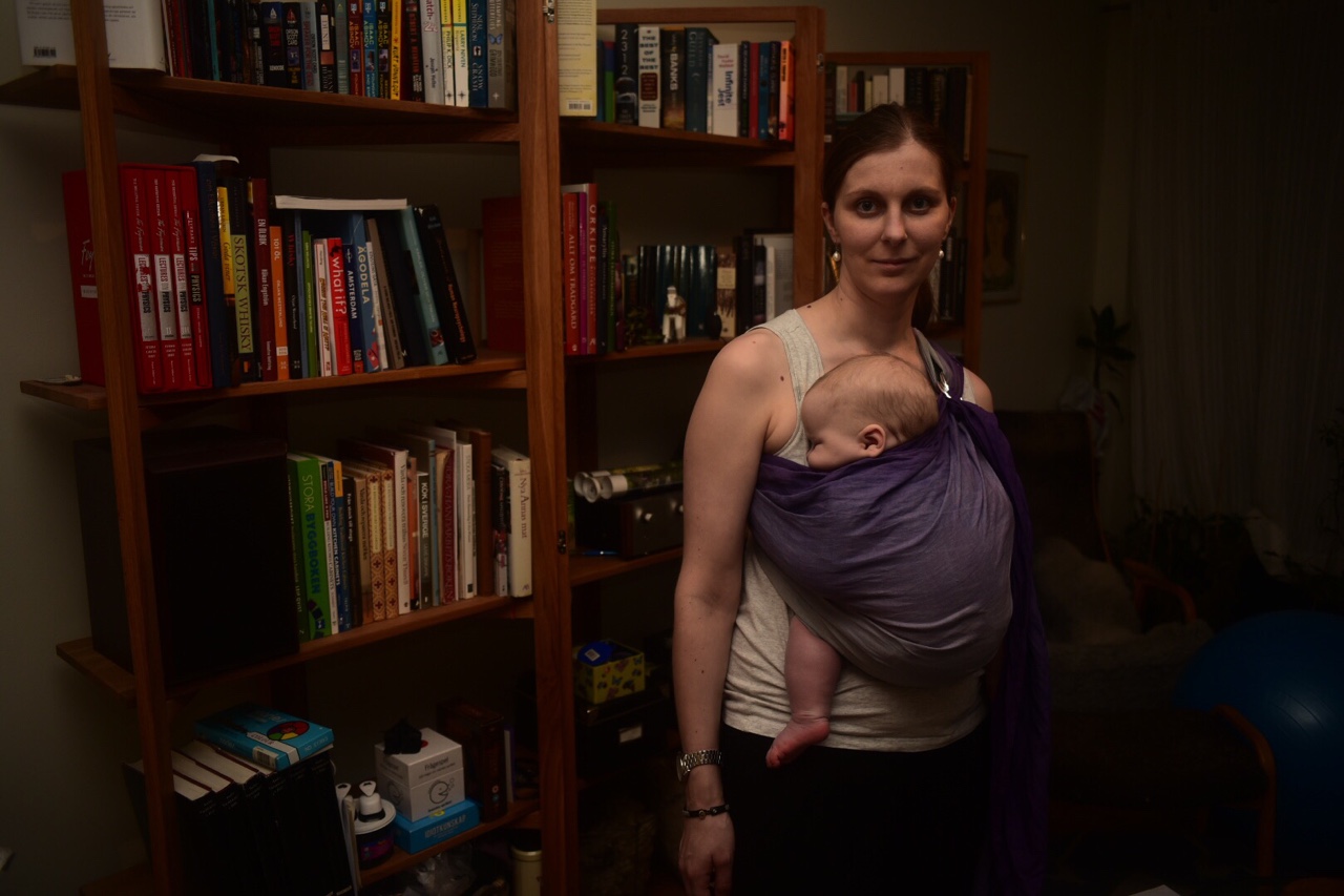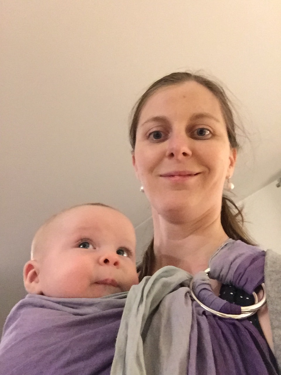 Andra dagen med ringsjal. Erik har somnat i pappas famn innan lunch och passar nu på att chilla med mamma innan middagen. Mycket behändigt sätt att bära för korta stunder hemma.